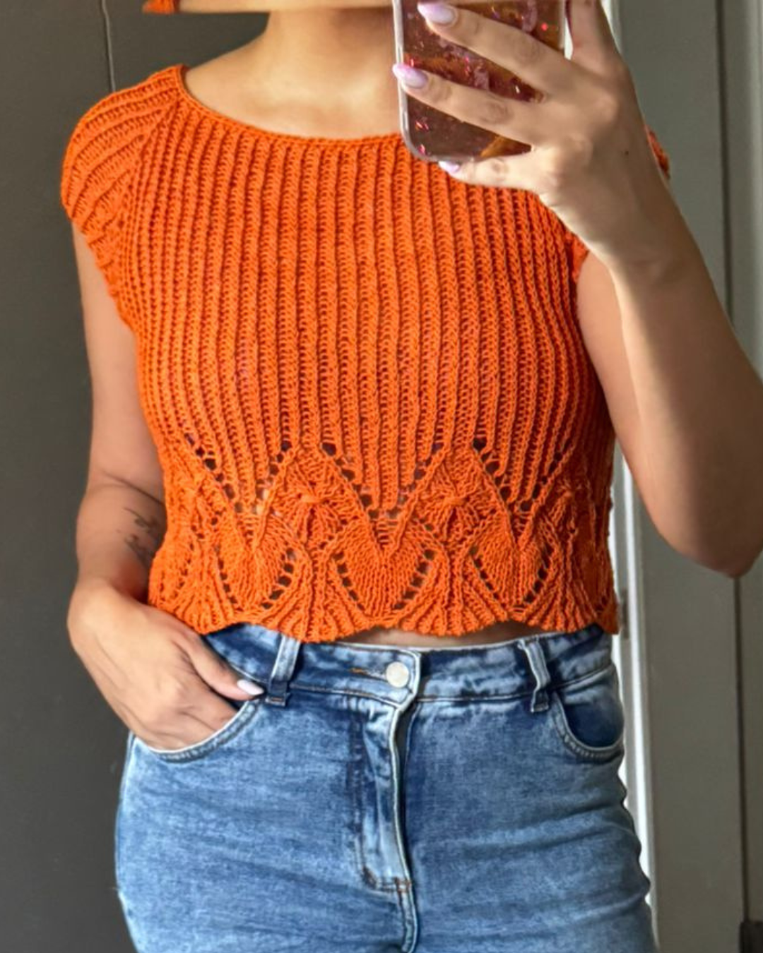 ¡Es un top con doble textura! un calado de hojas en la parte inferior y un punto acanalado en la parte superior! Esta doble textura crea un juego de transparencias delicado, con mucho movimiento y que se ajusta cómodamente a tu cuerpo!